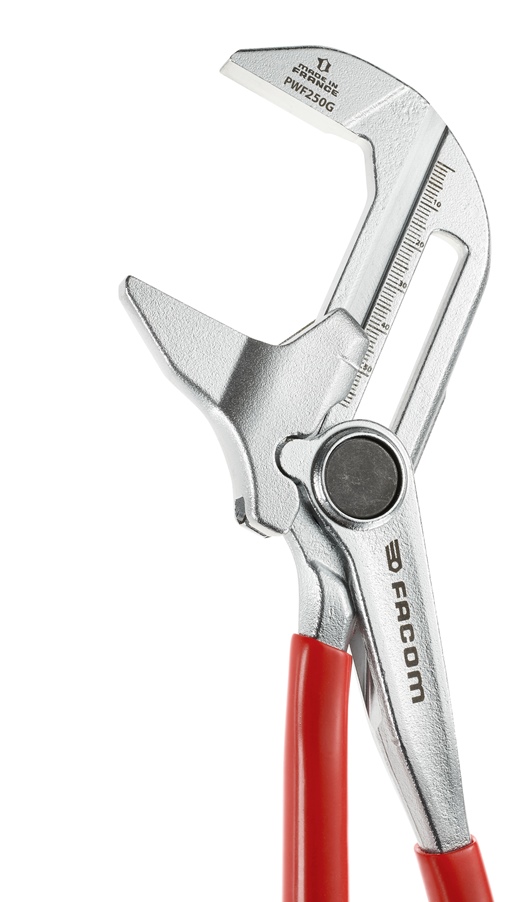 Facom PWF250G Zangenschlüssel 250mm / 10 inch G SerieRATSCHEN-SYSTEM: 2x schnellere, einfache Verstellung auf engstem Raum.BACKEN MIT GROßER KAPAZITÄT: Maximale Backenkapazität von 58 mmGLATTE, PARALLELE BACKEN: Beschädigungsfreies Arbeiten auf empfindlichen Oberflächen.PVC-GRIFFE: bieten Komfort und Einklemmschutz.SCHLANKES PROFILDESIGN: 16,8 mm; Maximaler Zugang in engen RäumenLASERMARKIERTE SKALA: Gewünschte Backenbreite in 20 Positionen einstellen.VERCHROMTE OBERFLÄCHE: Verbessert die Haltbarkeit und Korrosionsbeständigkeit.